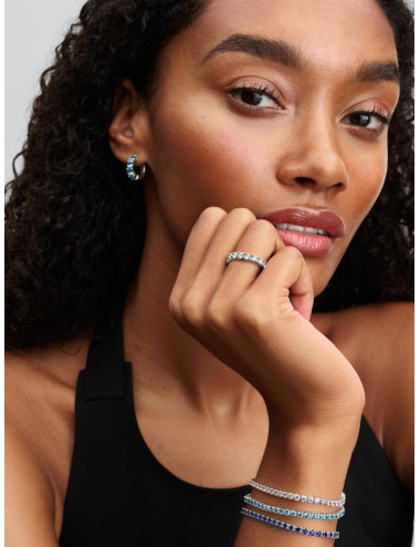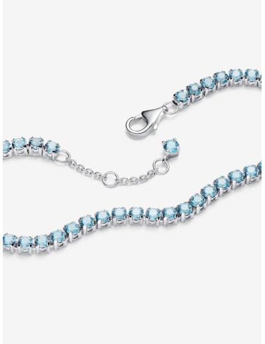Agrega un toque de elegancia a tu look con una pulsera tenis sofisticada que se presenta con una fila de gemas redondas y una gema más pequeña colgando del cierre, un diseño perfecto para llamar la atención. Empieza tu colección con una joya atemporal.